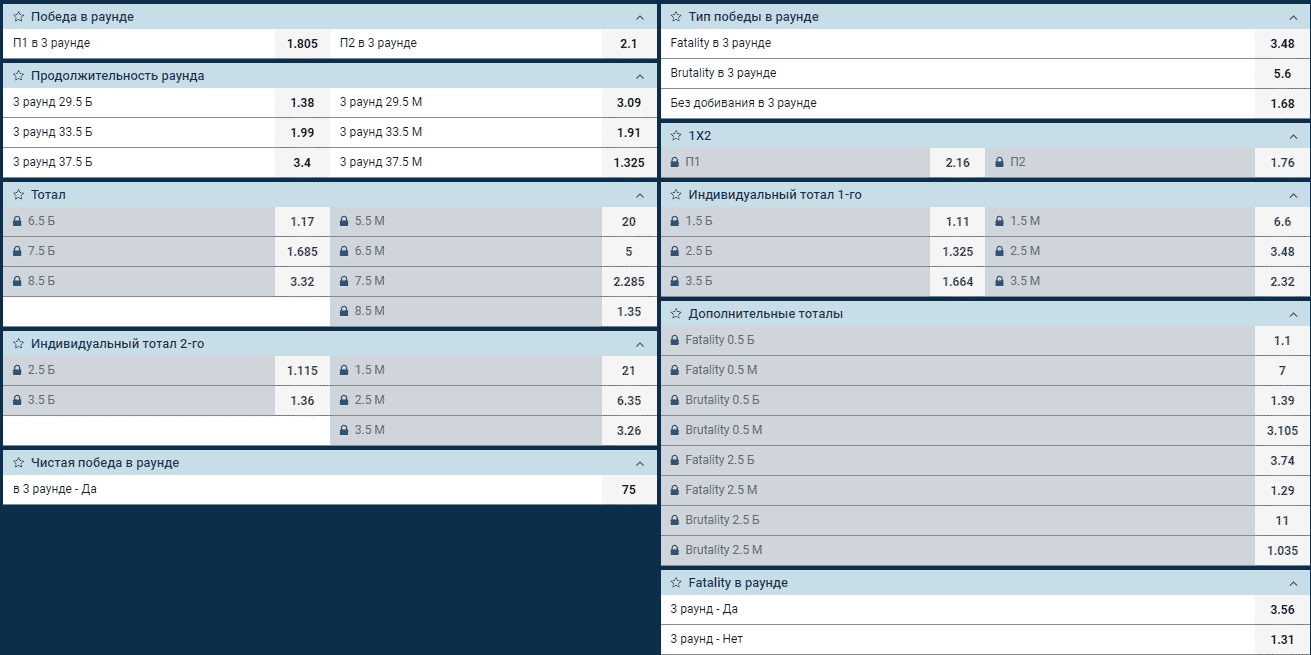 - Победа в турнире. Понятный исход на весь турнир, который длится до 5 побед одного из бойцов, тотал больше или меньше на количество раундов, индивидуальные тоталы на каждого участника поединка, дополнительные тоталы на фаталити (добиваний), сколько их всего будет в турнире.